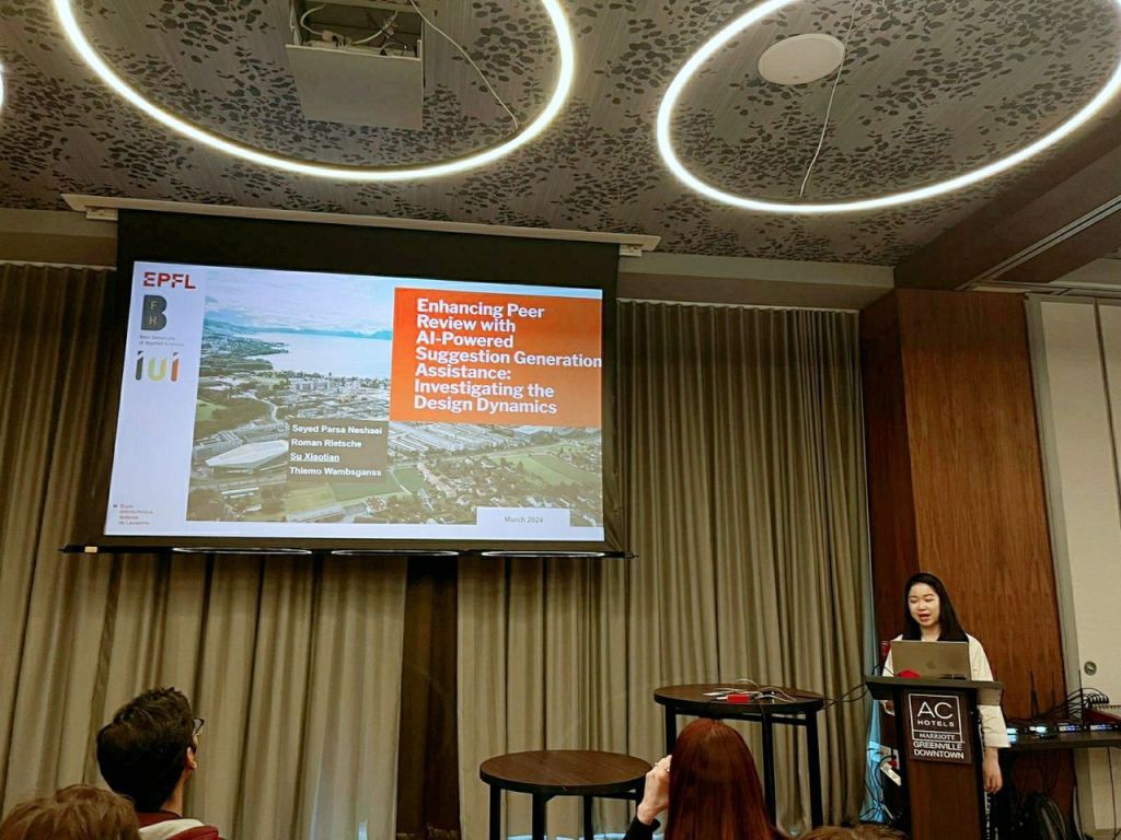 Last week we had the honor of presenting our latest paper titled “Enhancing Peer Review with AI-Powered Suggestion Generation Assistance: Investigating the Design Dynamics” at the renowned Intelligent User Interface (IUI) 2024 conference together with Xiaotian Su, Seyed Parsa Neshaei, and Roman Rietsche. This work represents a significant step forward in our commitment to improving the peer review process through cutting-edge AI technologies, focusing on the intricate balance of design dynamics to empower reviewers and editors alike (Link: https://lnkd.in/gthUJEUh)