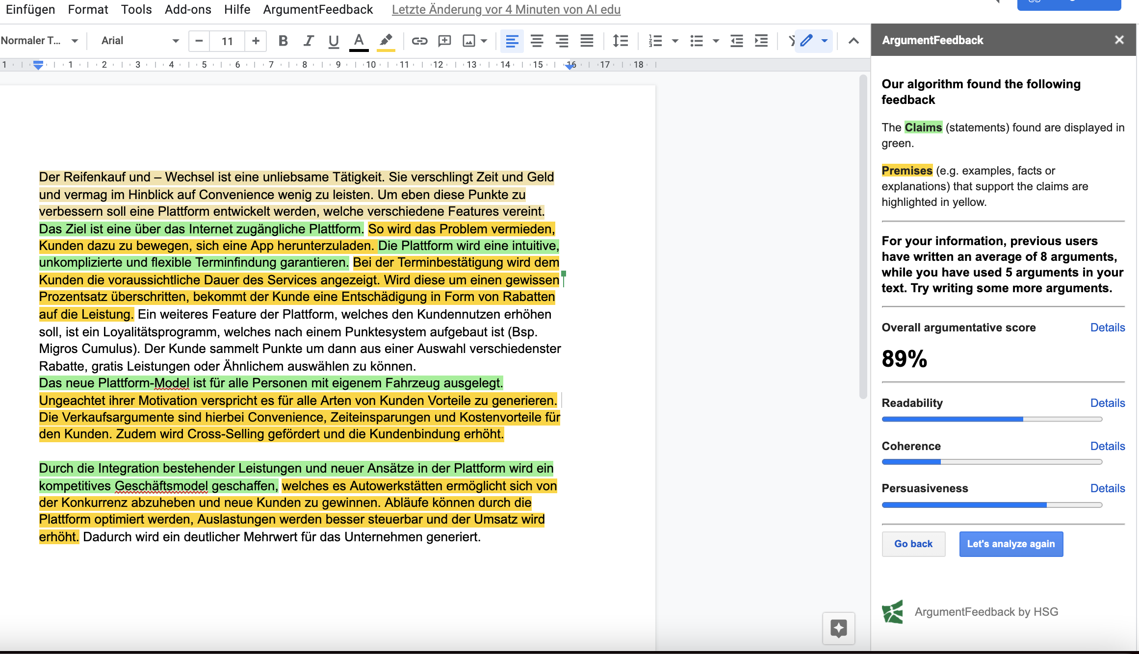 a Google Docs Add-on for argumentative writing support on business or project pitches